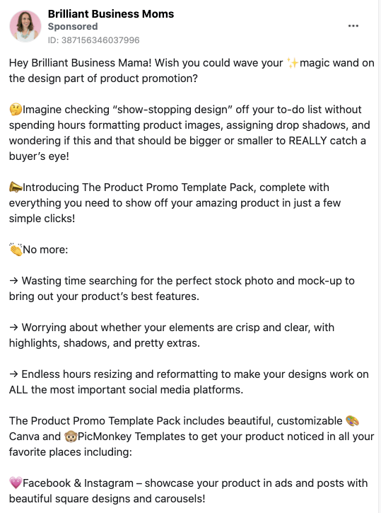 Here is a copywriting example from Brilliant Business Moms.